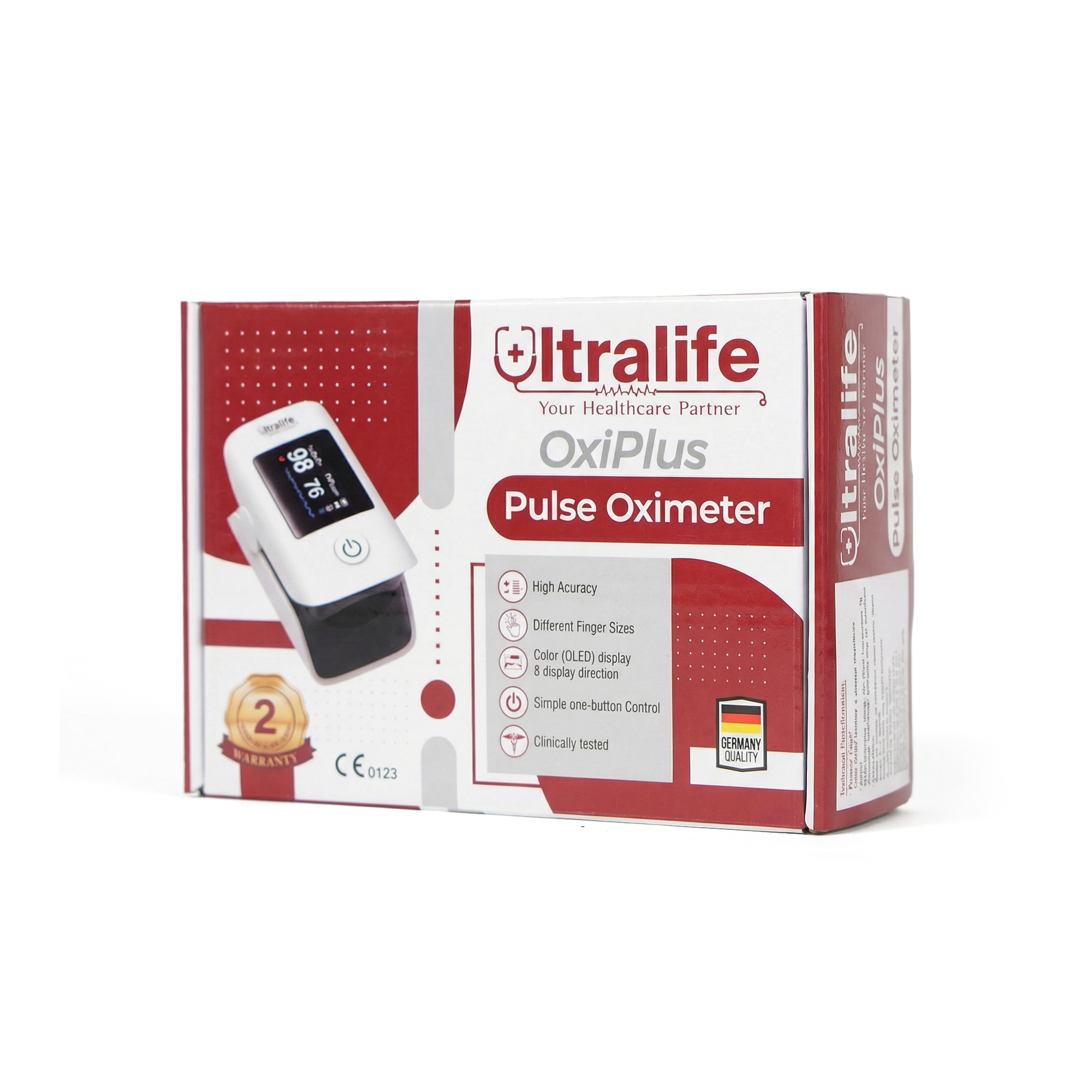جهاز عملي ودقيق من ماركة Ultralife الألمانية، مصمم لقياس نسبة الأكسجين في الدم ومعدل النبض بسهولة وفي ثواني قليلة، مناسب للاستخدام المنزلي والطبي.